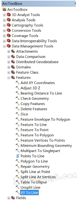 在ArcGIS 10.0的时候,新增了一个名字叫XY To Line(XY转线)的GP工具,打开ArcToolbox,找到Data Management->Features->XY To Line。