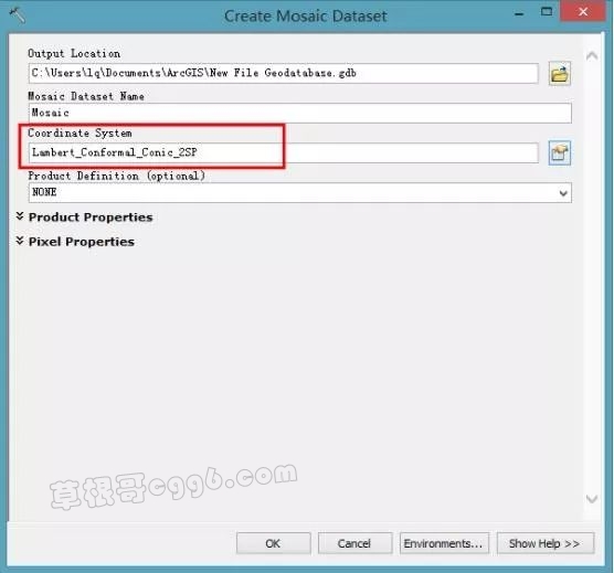 在弹出框中设置镶嵌数据集的名称为Mosaic,坐标系统为影像的坐标系统,点击OK。