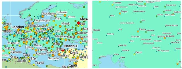 标注分组显示可以在不同的比例尺下显示符合设置条件的标注,它一般用作处理高密度要素的标注显示,通过设定要素属性的级别逐级比例尺下显示同一层越来越多的标注,避免标注的大量扎堆。如下图通过设置分类在不同比例尺下显示了不同丰度的标注信息。