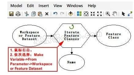 在ModelBuilder的主菜单中依次选择Insert->Iterators->Feature Classes,即可将迭代矢量数据的迭代器添加到工作区中。在Iterate Feature Classes上右击,依次选择Make Variable->From Parameter->Workspace or Feature Dataset,可以将输入矢量数据的变量显示在工作区中。