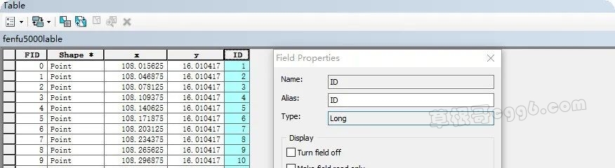 2.导出点label要素的属性表为Excel(97-03.xls格式)进行编号,导出前先增加一个长整型(long integer)字段ID,将FID的值计算过来,以便挂接回表格。