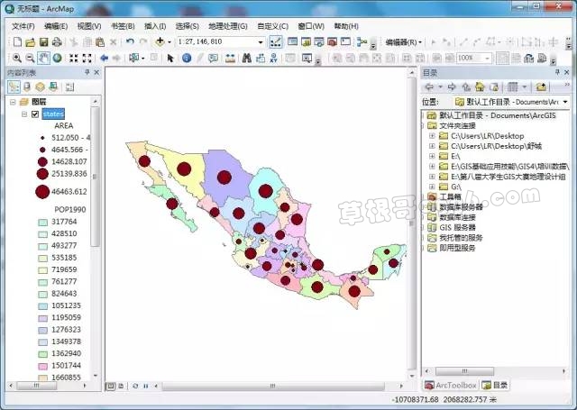 加载“states”图层,打开其符号系统中的数量类型,选择分级色彩,值选择“POP1990”,归一化选择“AREA”,得到1990年人均土地面积。