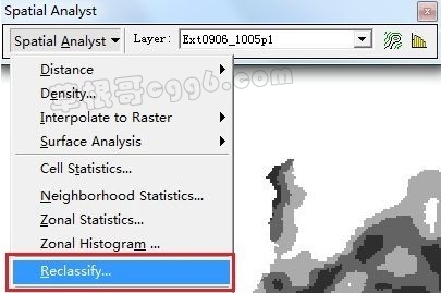 投影之后,就可以进行分类计算了,将投影后的影像图通过栅格分析工具进行重分类,选择Spatial Analyst工具栏下拉菜单的“Reclassify…”项