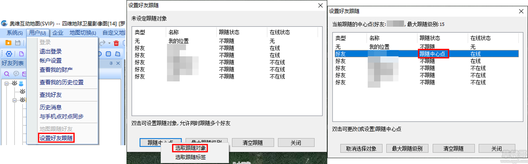 B.点击【跟随中心点】→【选择跟随对象】,双击列表中的某好友,当[跟随状态]显示为“跟随中心点”时,行驶过程中,该好友的位置会始终显示在您屏幕中心;